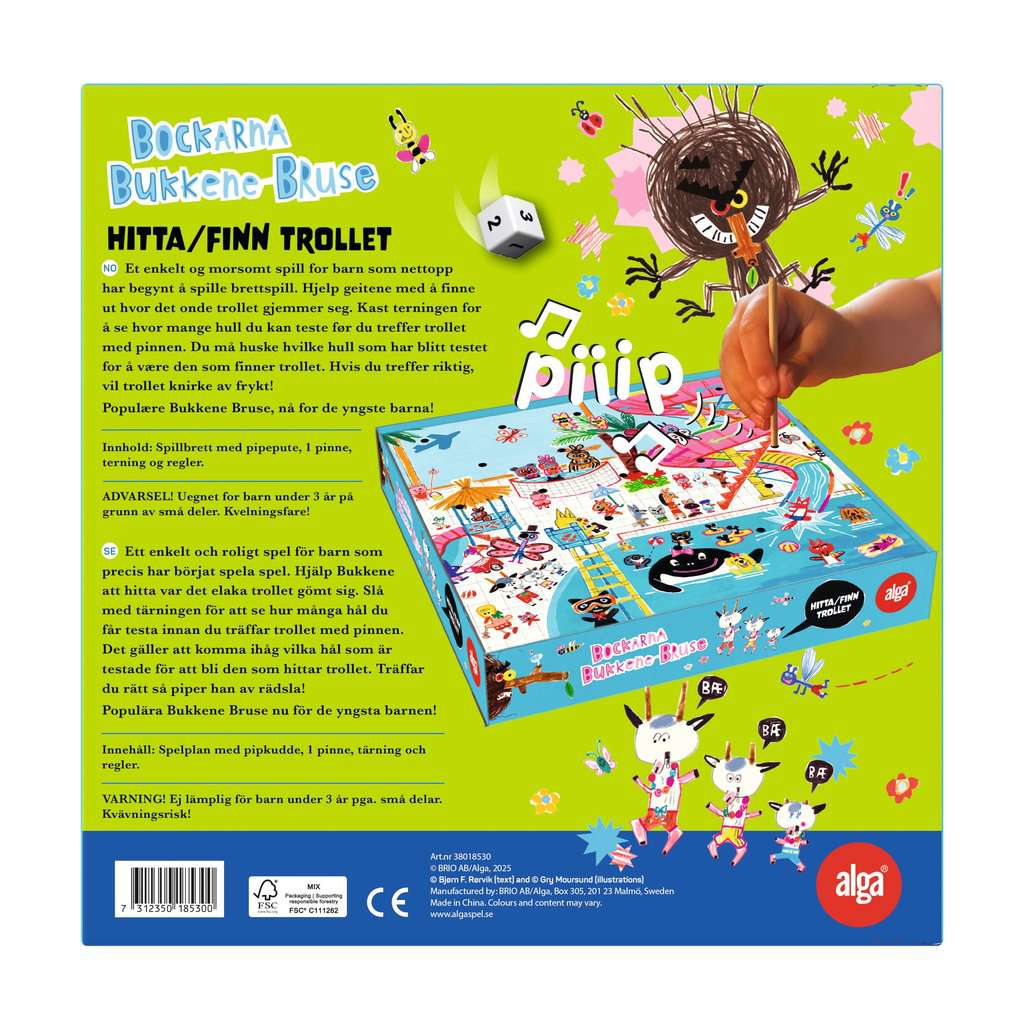 - Populära Bukkene Bruse nu för de yngsta barnen! Ett enkelt och roligt spel för barns om precis har börjat spela spel. Hjälp Bukkene att hitta var har det elaka trollet gömt sig? Slå med tärningen för att se hur många hål genom spelplanen du får testa innan pinnen träffar trollet. Det gäller att komma ihåg vilka hål som är testade för att bli den som hittar honom. Då piper han av rädsla!